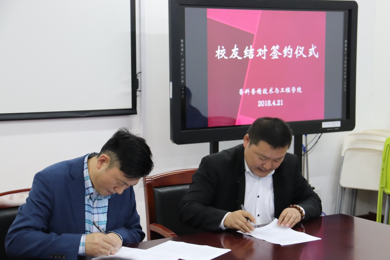 “饮水思源•薪火相传”校友导师项目是意义深远的校友活动,能充分利用活跃在行业中高端的优秀校友作为校外资源,创新行业技术人才的培养渠道,同时,希望校友们也能结合行业和专业的生存环境和需求,给学校的专业设置和课程改造带来更多专业的指导和建议,有利于我院更好地培育“工程师文化”,让优秀的行业、专业、职业传统薪火相传。同时也为优秀校友饮水思源、回报母校提供一个机会。学院向4位校友导师颁发聘书,4对导师和定向学生一起,在“香料学院校友导师与定向学生结对协议书”上签字。