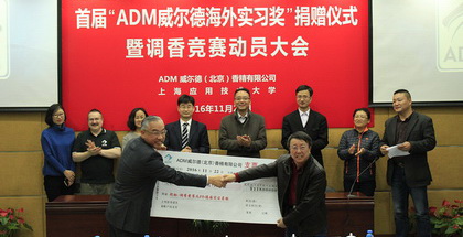 11月22日,ADM威尔德(北京)香精有限公司“威尔德海外实习奖”捐赠仪式暨调香竞赛动员大会举行,ADM北亚太总裁陈冬、校学工部部长袁翔和香料香精联合党委书记李建民出席。ADM威尔德香精与特殊配料事业部中国区总经理白玉山及我校团委、教务处、香料学院等部门相关负责人参会。香料学院、工创学院160余名师生到场聆听。